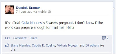This week hasnt been all that blissful, Ive been nauseated, I had my first pregnancy puke yesterday, I have cramps and these prenatal vitamins are horse pills!!....But nothing makes me feel better than seeing how Dominic is reacting to the news. It's as if hes on daddy mode already, somehow hes turned into a great chef, and has been cooking. Ive been doing the dishes mostly.